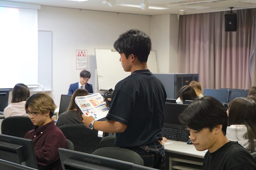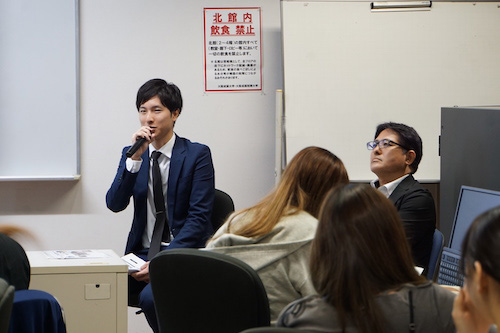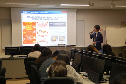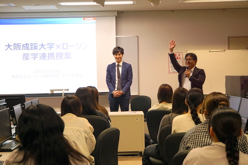 2025年10月8日(水)、経営学部 経営学科 食ビジネスコースは「食品開発実践」(担当 髙畑 能久教授)の授業にて 株式会社ローソン 近畿カンパニー 近畿商品部 部長 宮城 大輔 氏、マーチャンダイザー 佐々木 雄哉 氏をお招きして特別授業を実施しました。