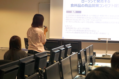 スイーツ等実際のヒット商品を例に挙げ、商品開発の進め方や注意するべきポイント、仮説と分析?検証の重要性などマーケティングの流れが実感できる密度の濃い講義でした。